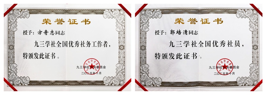 近日,在庆祝九三学社创建80周年之际,九三学社中央委员会印发《九三学社中央关于表彰全国优秀社员、全国优秀社务工作者、全国优秀省级组织和全国优秀基层组织的决定》,对在工作中作出突出成绩的省级组织、基层组织、社员和社务工作者进行评选表彰。九三学社社员方奇志、郭培清分别荣获九三学社创建80周年“全国优秀社务工作者”“全国优秀社员”称号。